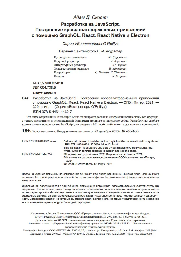 JavaScript Everywhere: Building Cross-Platform Applications with GraphQL, React, React Native, and Electron / Разработка на JavaScript. Построение кроссплатформенных приложений с помощью GraphQL, React, React Native и Electron Год издания: 2021 Автор: Adam Scott / Адам Скотт Издательство: Питер ISBN: 978-5-4461-1462-7 Серия: Бестселлеры O'Reilly Язык: Русский Формат: PDF Качество: Издательский макет или текст (eBook) Интерактивное оглавление: Да Количество страниц: 320 Описание:
