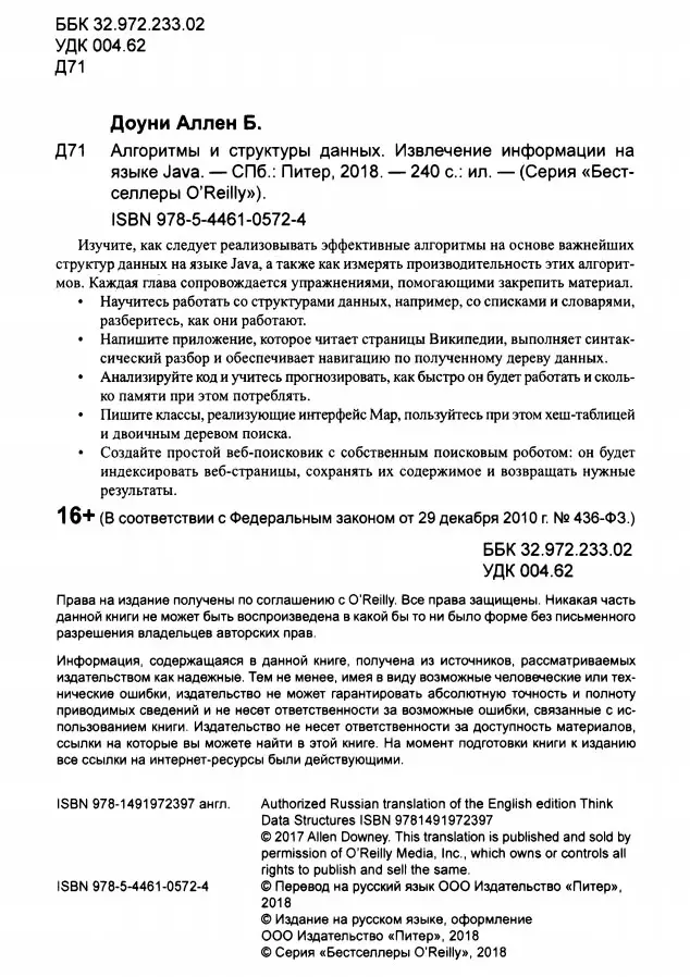 Think Data Structures / Алгоритмы и структуры данных. Извлечение информации на языке Java Год издания: 2018 Автор: Allen Downey / Аллен Доуни Переводчик: Синица К. Издательство: Питер ISBN: 978-5-4461-0572-4 Серия: Бестселлеры O'Reilly Язык: Русский Формат: PDF Качество: Отсканированные страницы + слой распознанного текста Интерактивное оглавление: Да Количество страниц: 242 Описание: Изучите, как следует реализовывать эффективные алгоритмы на основе важнейших структур данных на языке Java, а также как измерять производительность этих алгоритмов. Каждая глава сопровождается упражнениями, помогающими закрепить материал. • Научитесь работать со структурами данных, например, со списками и словарями, разберитесь, как они работают