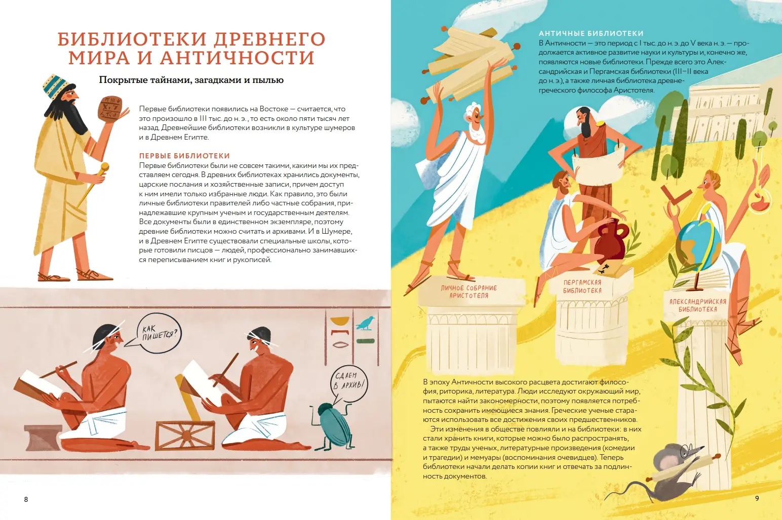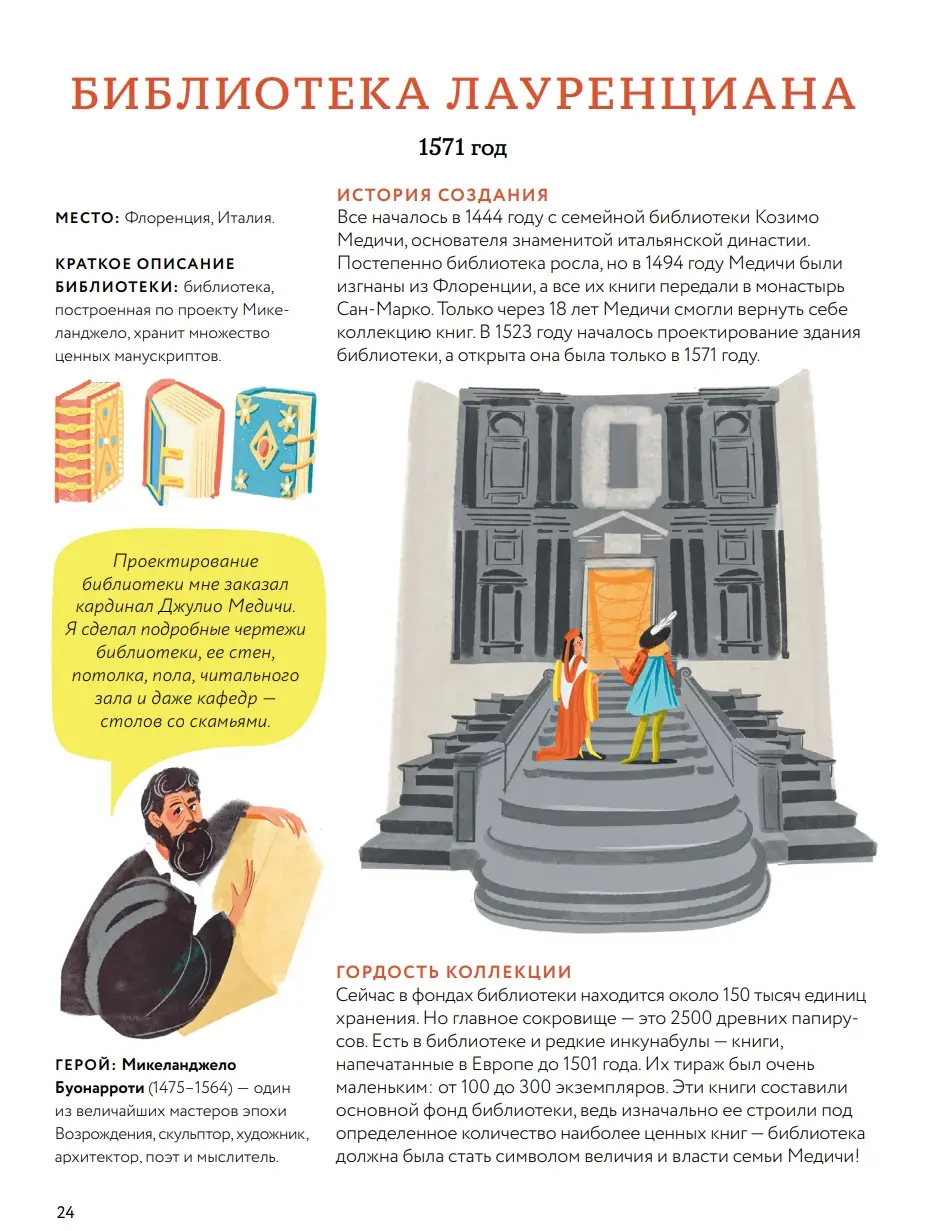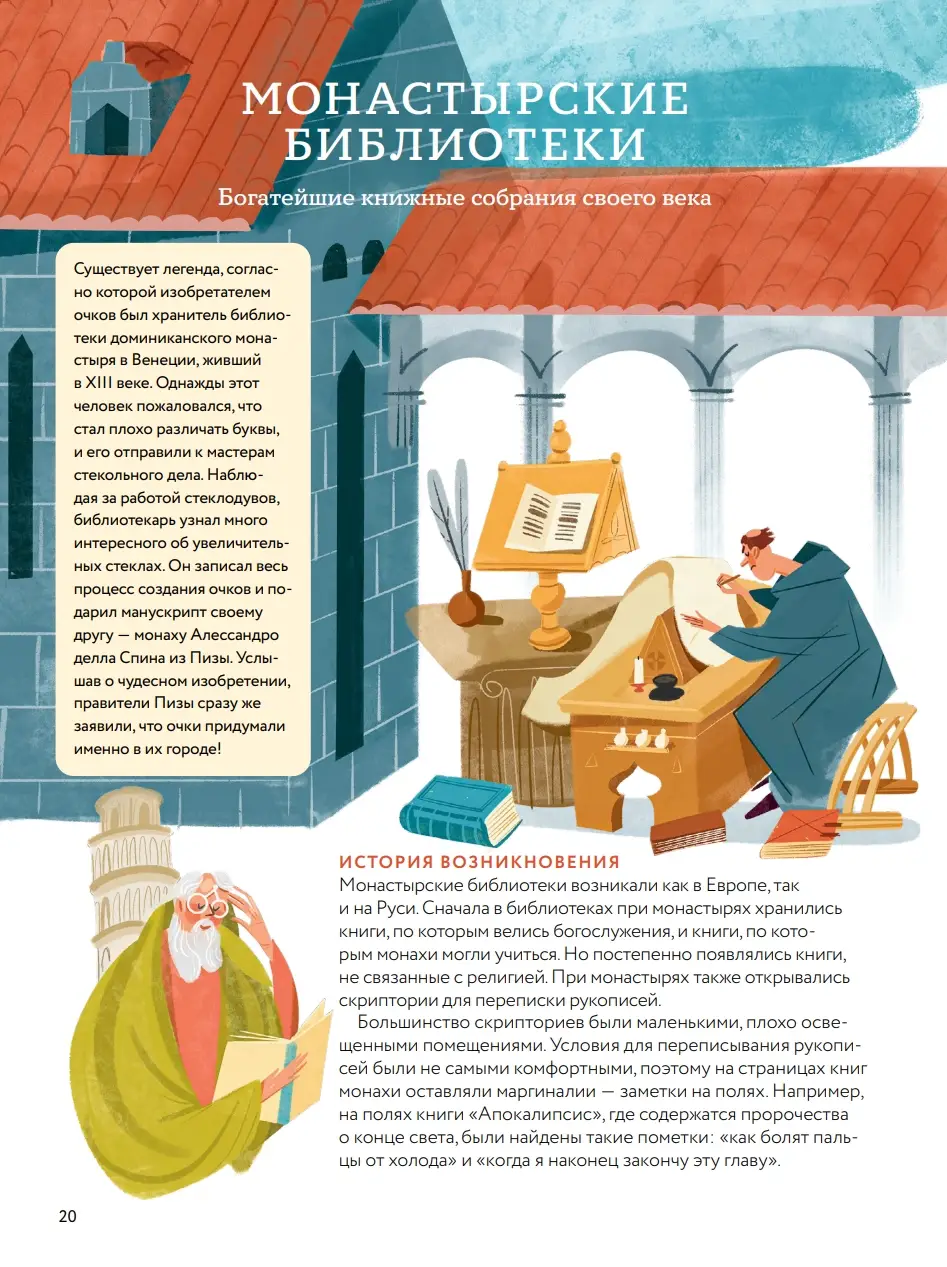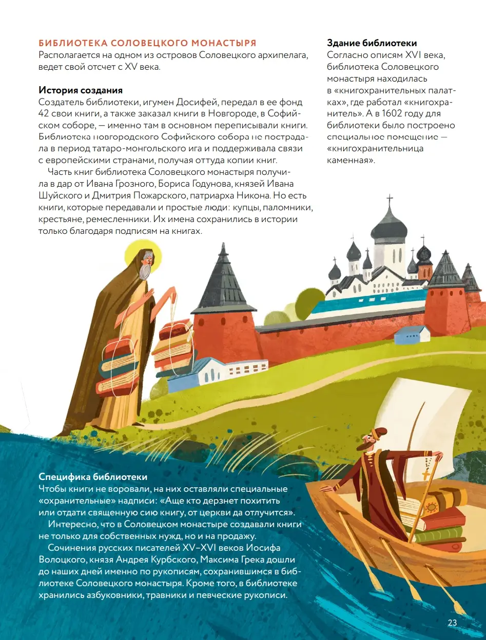 Люди веками накапливали знания и пытались сохранить их для будущих поколений. По этой причине историки, философы и правители собирали свои библиотеки. Сейчас, в эпоху интернета, может показаться, что библиотеки уже никому не нужны... Но так ли это? Давай узнаем вместе! Мы отправляемся в историческое путешествие по самым знаменитым и необычным библиотекам мира. Особенноcти книги: