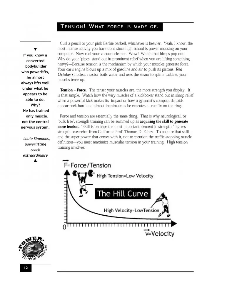 How tension generates force…..How to maximize muscular tension for traffic-stopping muscular definition…The five keys to high tension training…The inverse relationship between velocity and strength….Flexing to maximize tension…The function of the mechanoreceptors in regulating strength….Using Henneman's size principle to maximize muscular recruitment....Why high values of fatigue and tension are mutually exclusive.