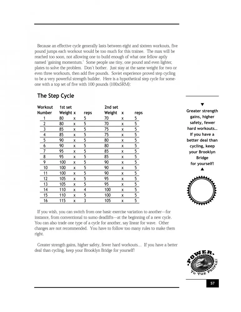The fallacy of the Milo myth…..The pitfalls of over-prolonged training….Making improvements through reduction….Periodization or cycling—a revolutionary approach to strength training…..How to make gains year after year….Why 'softening up' can reward you with new strength breakthroughs…The ultimate formula for strength…..How to gain beyond your wildest dreams—with less chance of injury….How to avoid burnout….How to perform the Linear Cycle for new personal records….. Wave cycling and dealing with gaps in your training….The Flexible Wave Cycle….. The Structured Wave Cycle…. The Step Five Cycle.