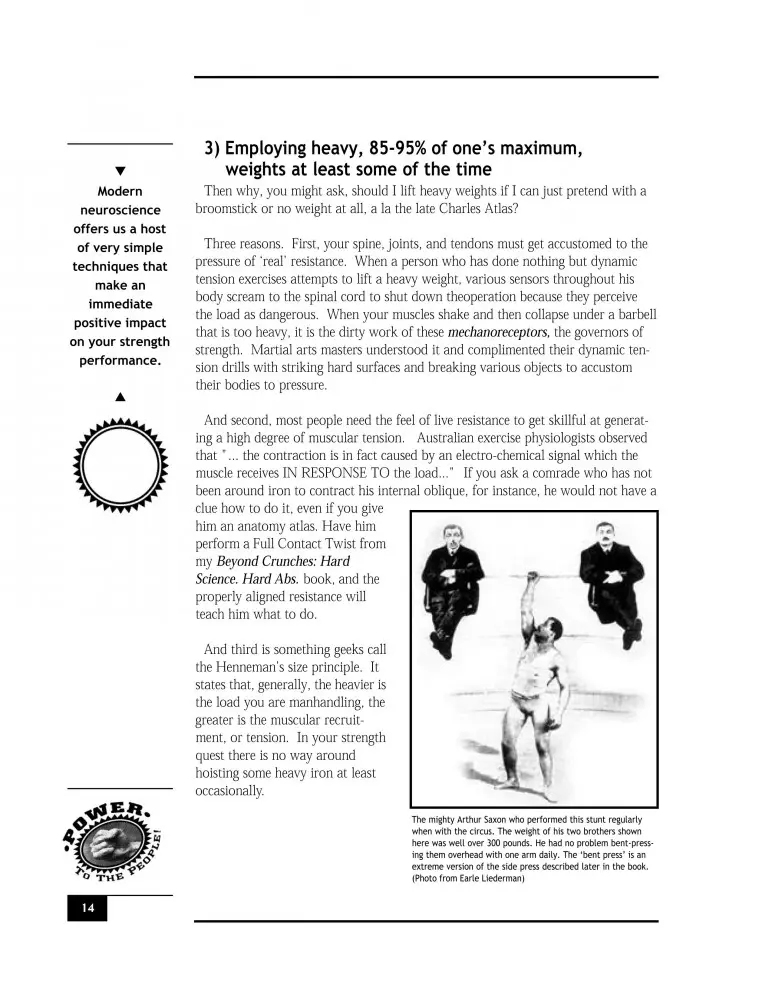 Pavel's "Power to the People" shows the reader how to run extremely efficient workout sessions, by maximizing strength gain and minimizing mass gain, fatigue and injury as well as eliminating post-workout muscle soreness and stiffness. If your goal is to bulk up, Pavel covers techniques to gain maximum results. By treating the body as a system, Power to the People rarely if ever isolates just one muscle group but rather involves several at once. This leads to the kind of functional strength that combat sports athletes and special operators in the military prize. The book is at once entertaining and informative. Pavel's playful Russian personality shines through on every page, making it easy to read, even if the physical training is incredibly intense. The most unusual aspect of this work is that it contains the information one would expect from a text book yet has the functionality of a cookbook. If you are ready to see real results in less time, and are willing to work harder than ever before, get Power to the People!, Comrade!