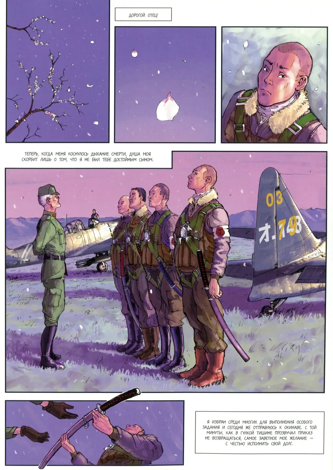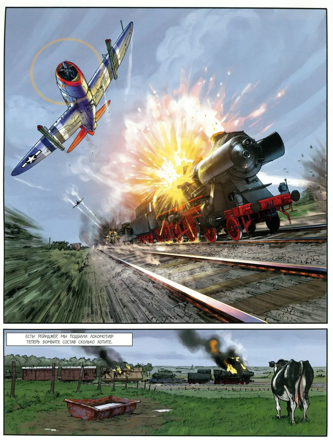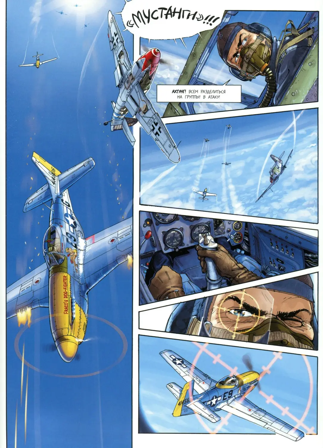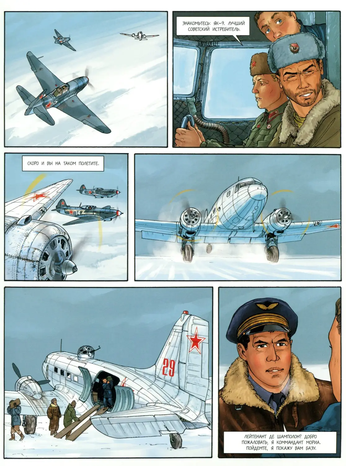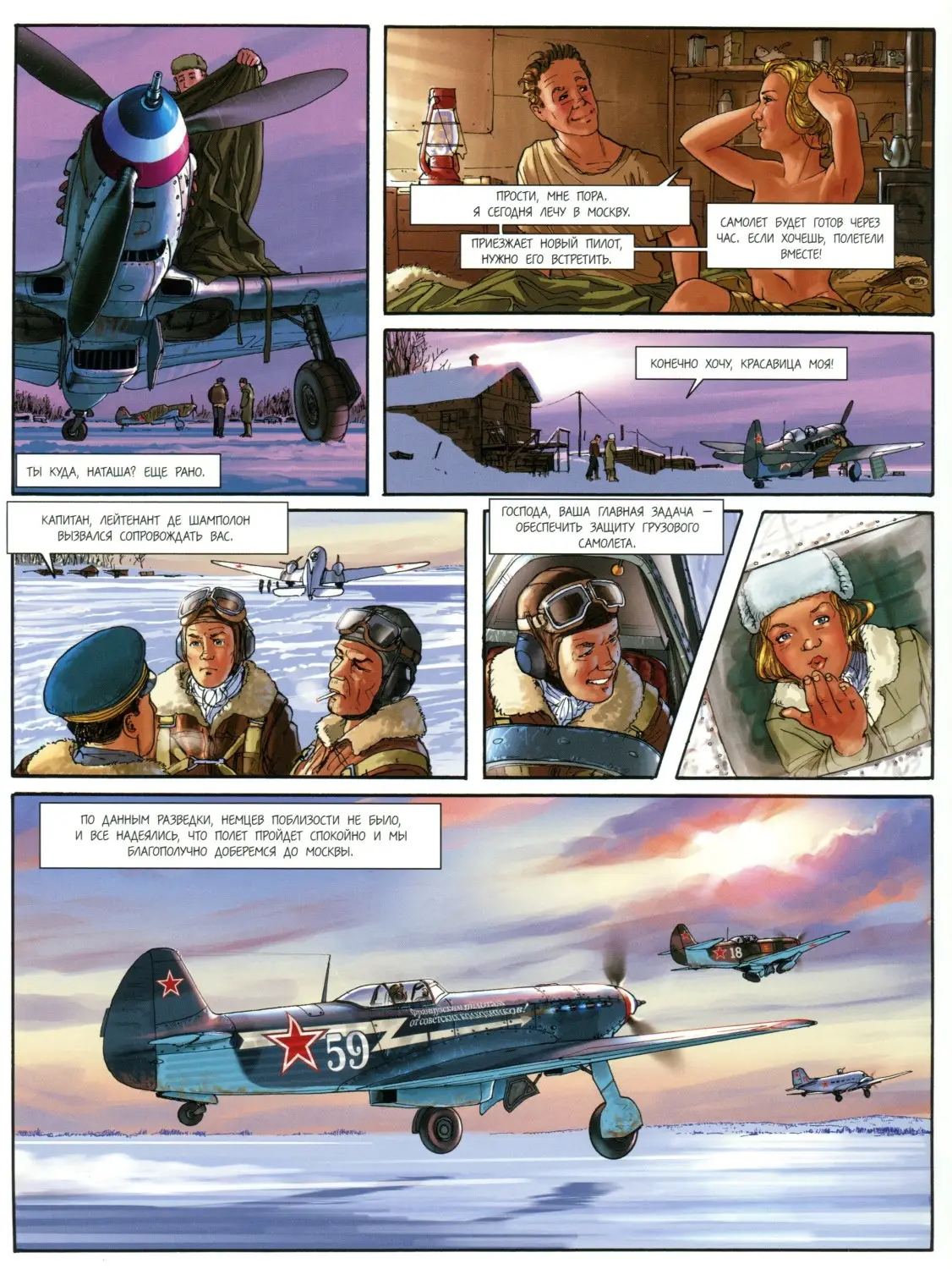 Легендарные истребители Второй мировой войны - "Як" и "Мессершмитт", "Зеро" и "Молния" - сойдутся в воздушных дуэлях на страницах этой книги! Благодаря мастерству сценариста и художника Ромена Гюго сюжет простирается далеко за пределы летного искусства, отражаясь в душе пилотов-асов, каждый из которых - прежде всего Человек. "Рыцари неба" - последний выдох легендарного издательства "Комикс" в качестве издателя непосредственно комиксов. Тем и представляет символический интерес для тех, кто интересуется медиумом в том числе и с букинистической точки зрения. В целом же Le dernier Envol существует во вполне приличной сканлейт версии. По вёрстке и переводу любительский вариант может кому-то показаться даже более удовлетворительным. Примеры страниц:-