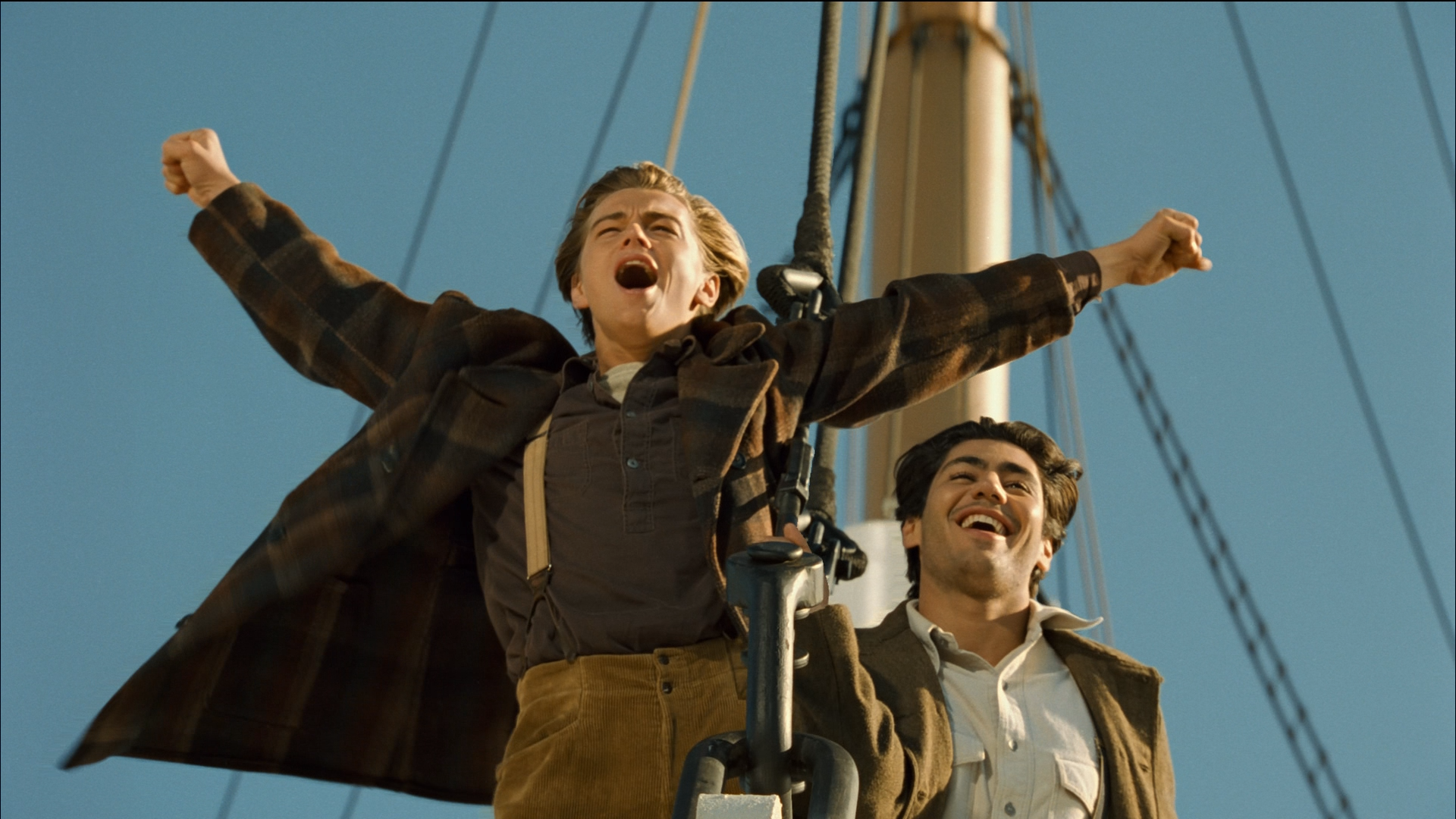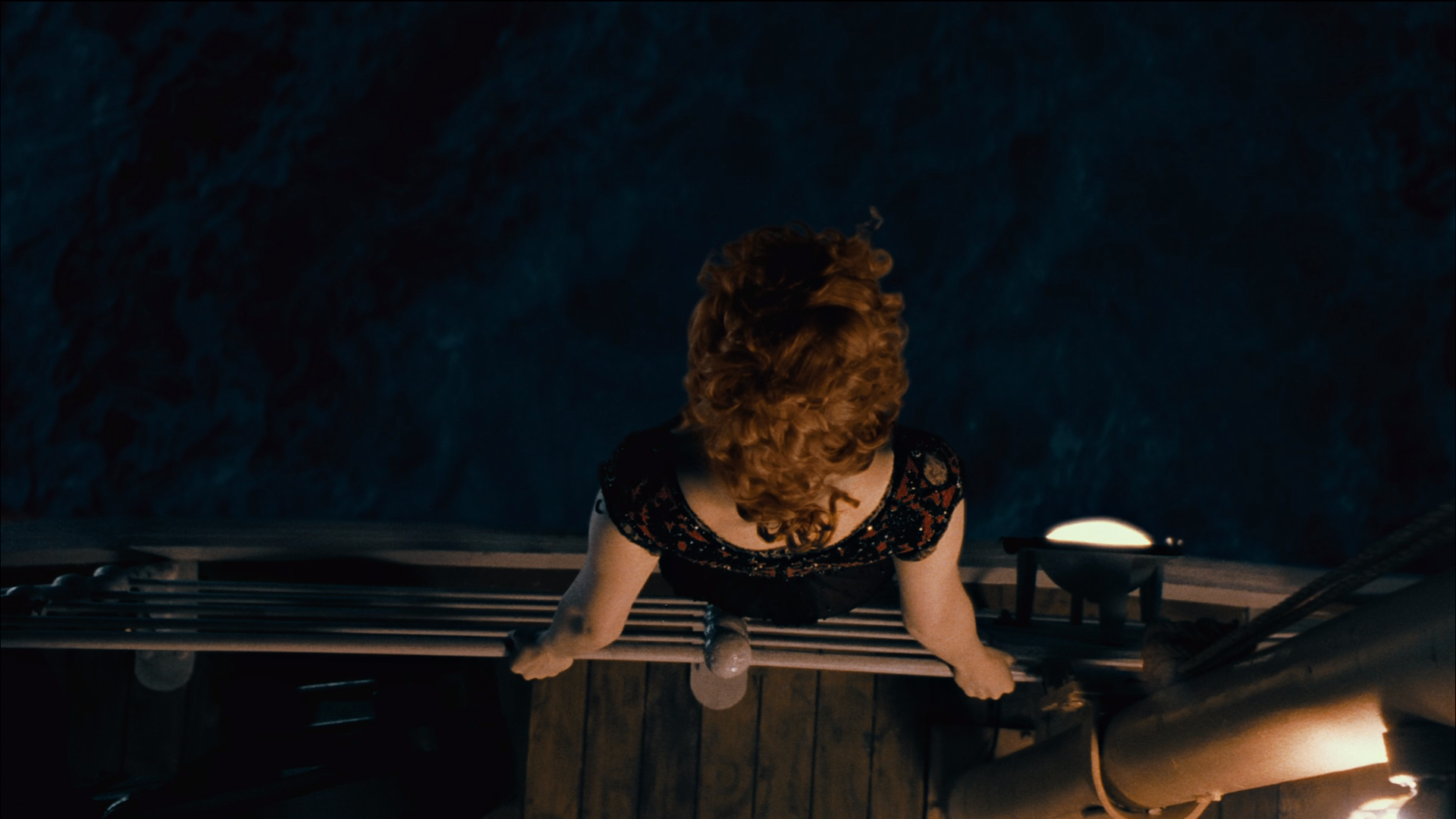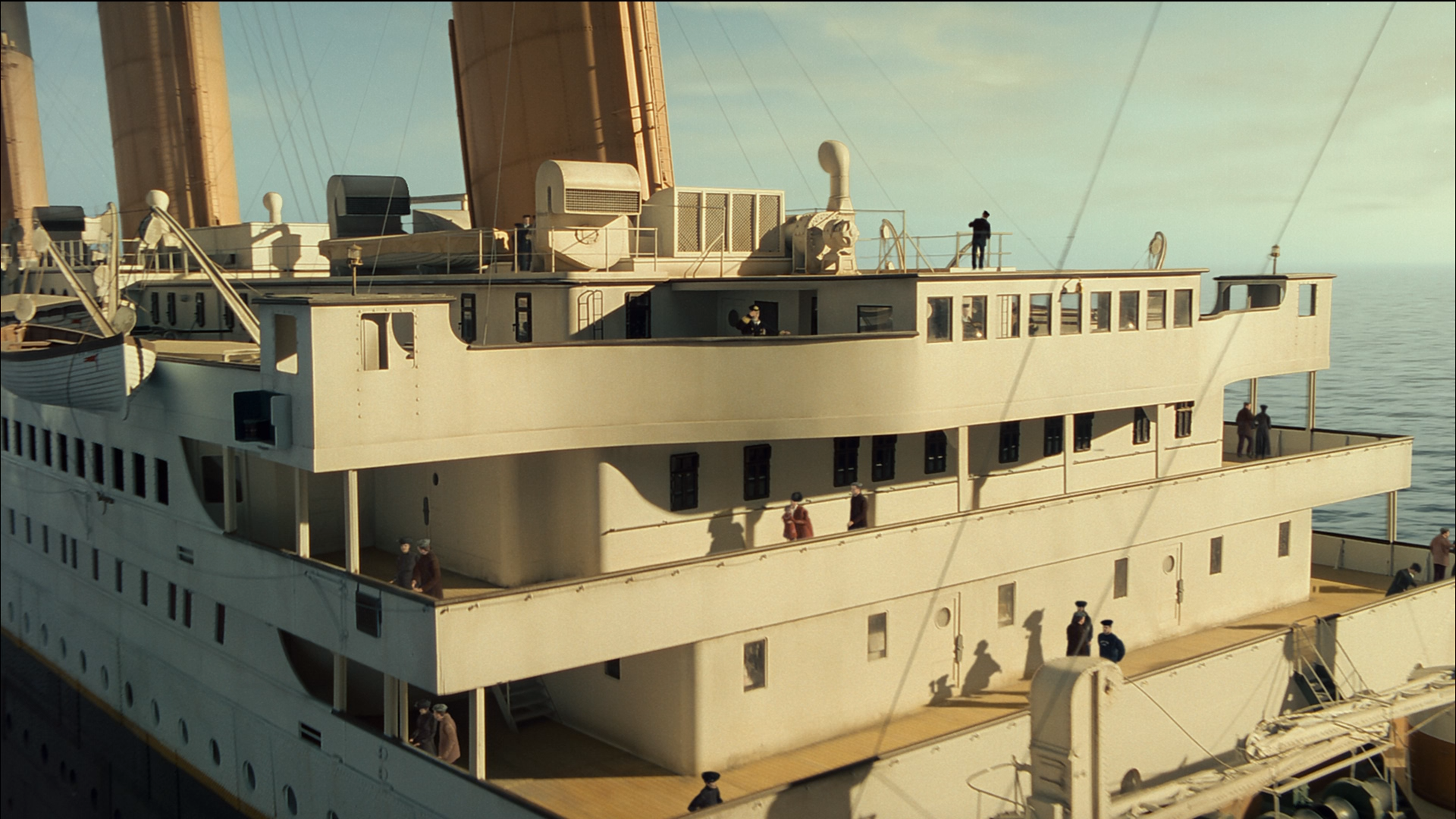 Задняя часть макета корабля была помещена на специальную платформу, позволявшую быстро принять вертикальное положение. Всего для съемок этой сцены было сделано 10 дублей, каждый из которых потребовал участия около сотни падающих каскадеров.